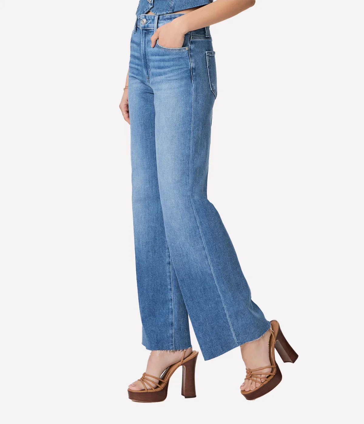 This ultra high-waisted wide leg has an easy, relaxed fit with a raw hem and a 31” inseam. This pair is cut from PAIGE VINTAGE denim in an authentic blue wash with natural fading and classic lived-in details.