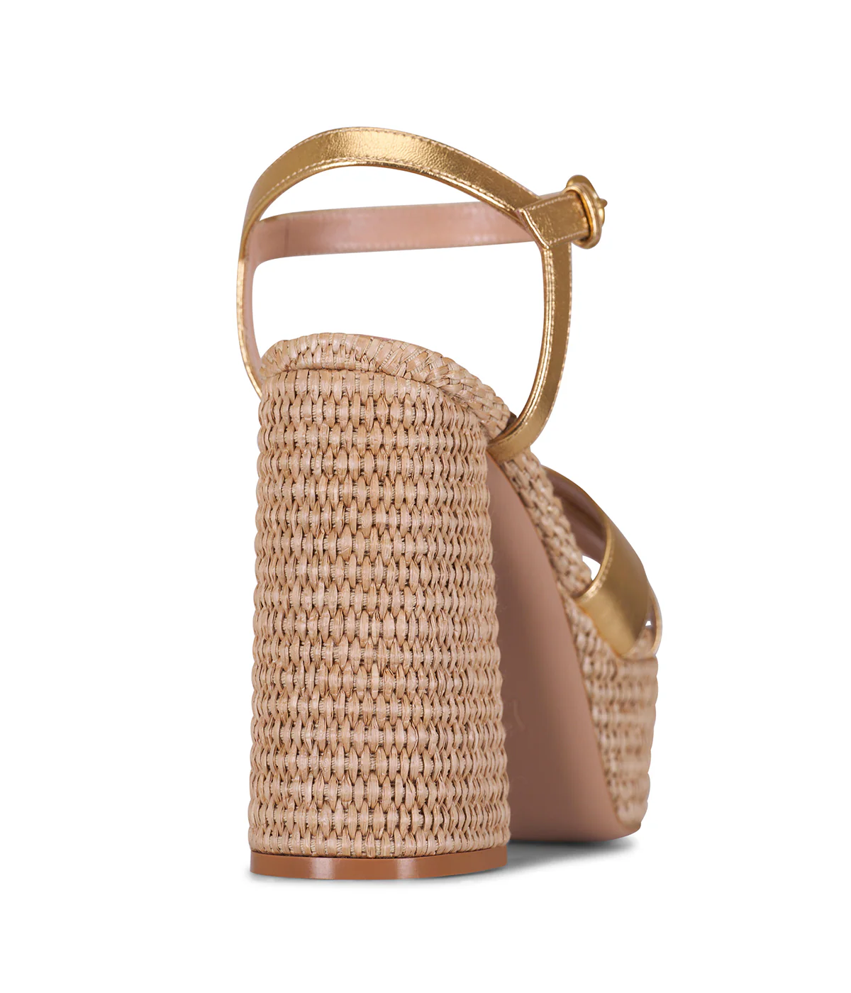 - Chunky platform and block heel wrapped in woven rattan-like detailing