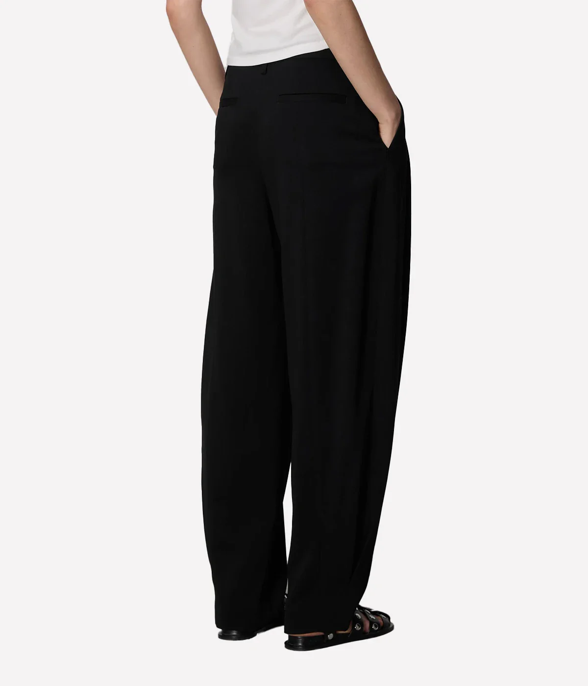 The Cecily. These trousers are tailored with not-so-subtle pleats to achieve a tapered silhouette. Crafted in a fluid, yet refined stretch viscose crepe. Complete the look with our Ethel halter vest.