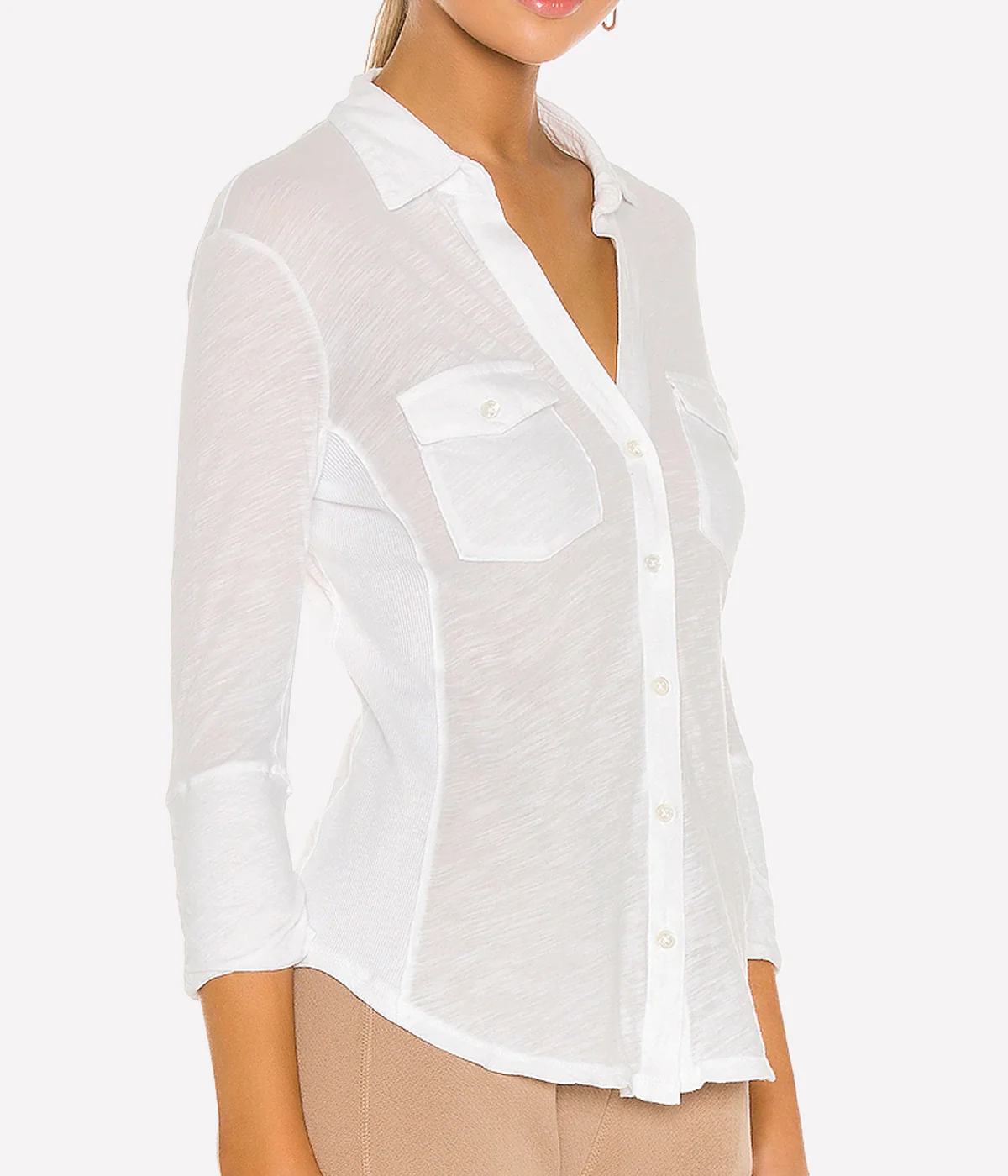 The James Perse Contrast Panel Shirt is crafted from slub Supima cotton, offering a lightweight feel perfect for warmer months. With a slim silhouette, V-neckline, button down and cropped sleeves, this shirt is designed for a neat tuck.