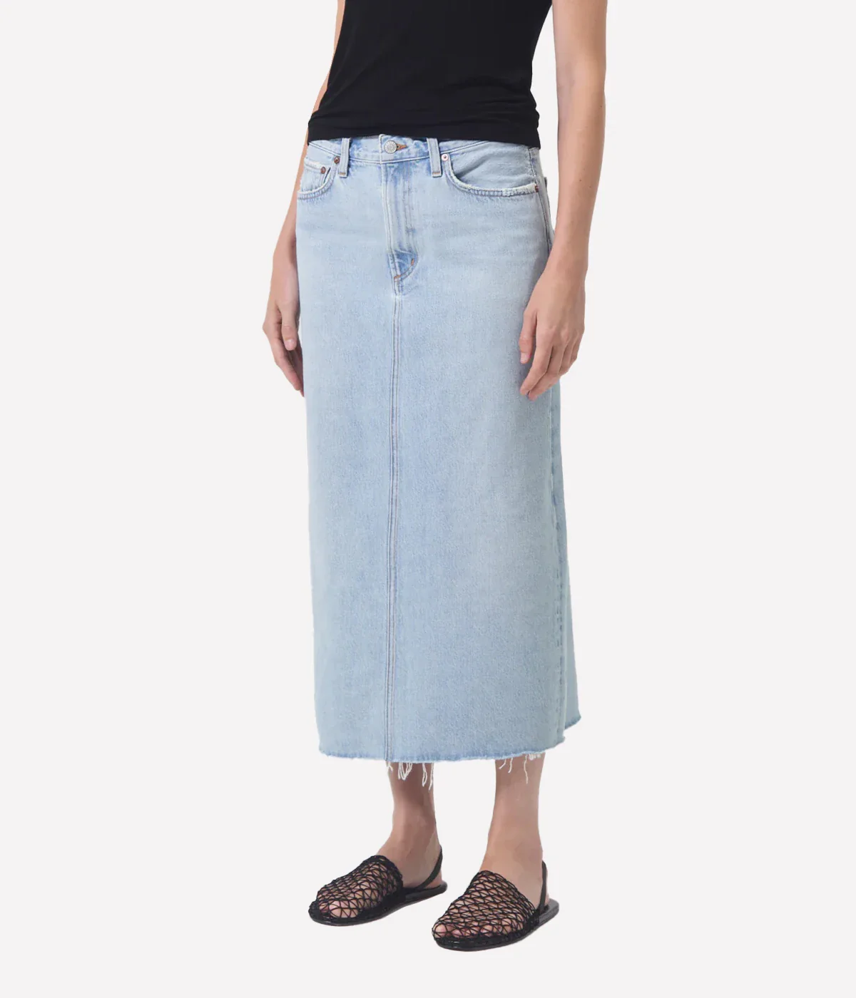 A sleek, ankle-grazing skirt crafted in light-washed indigo denim with a raw hem.
