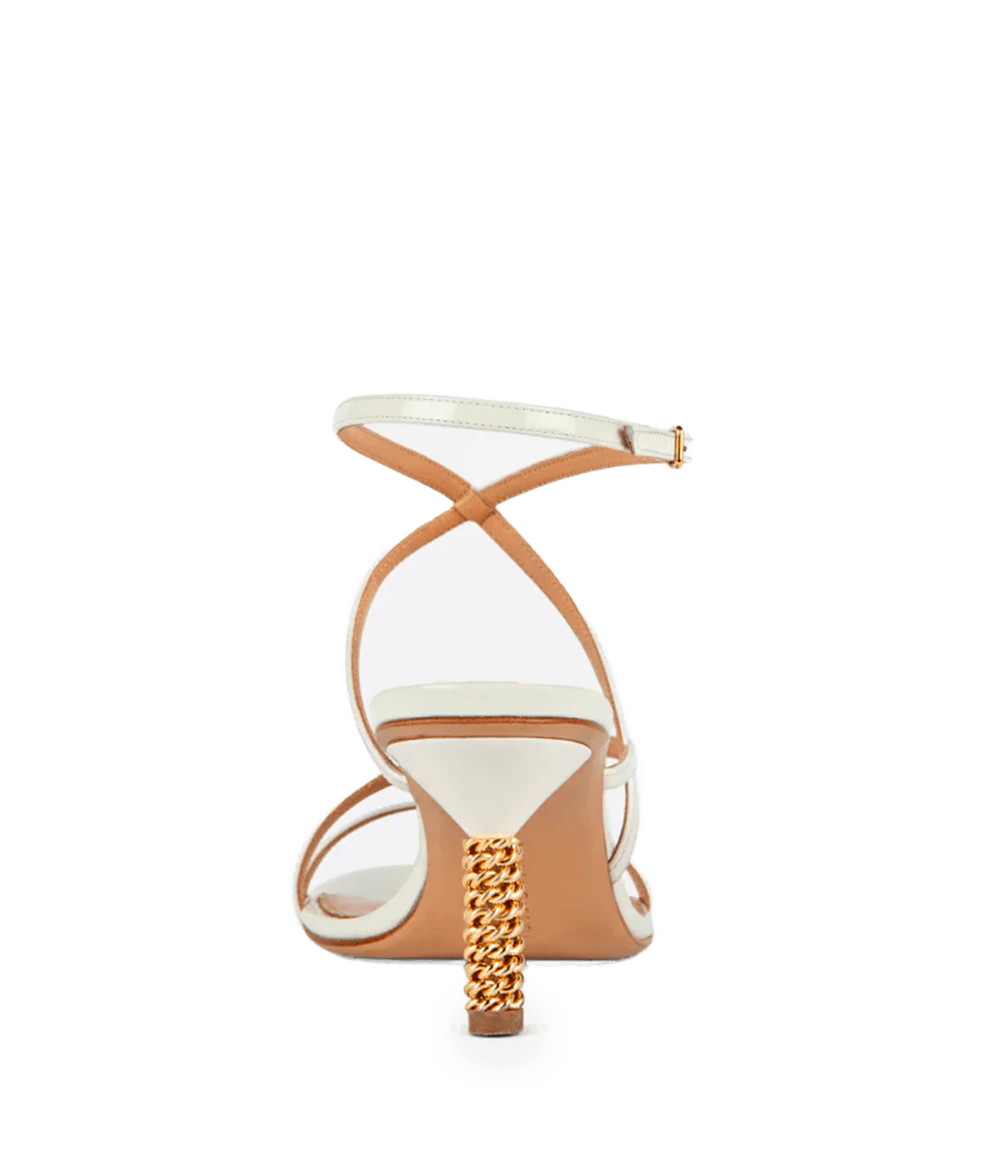 An elegant, low heel with white leather straps, gold buckle fastening and a metallic gold rope detail on the heel.
