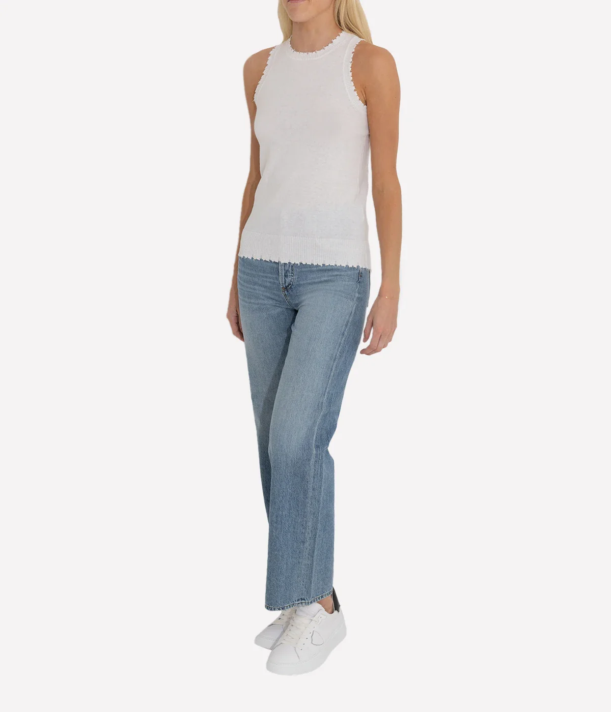 A wear-everywhere white tank with frayed edges and soft stretch – effortlessly cool with a timeless edge.