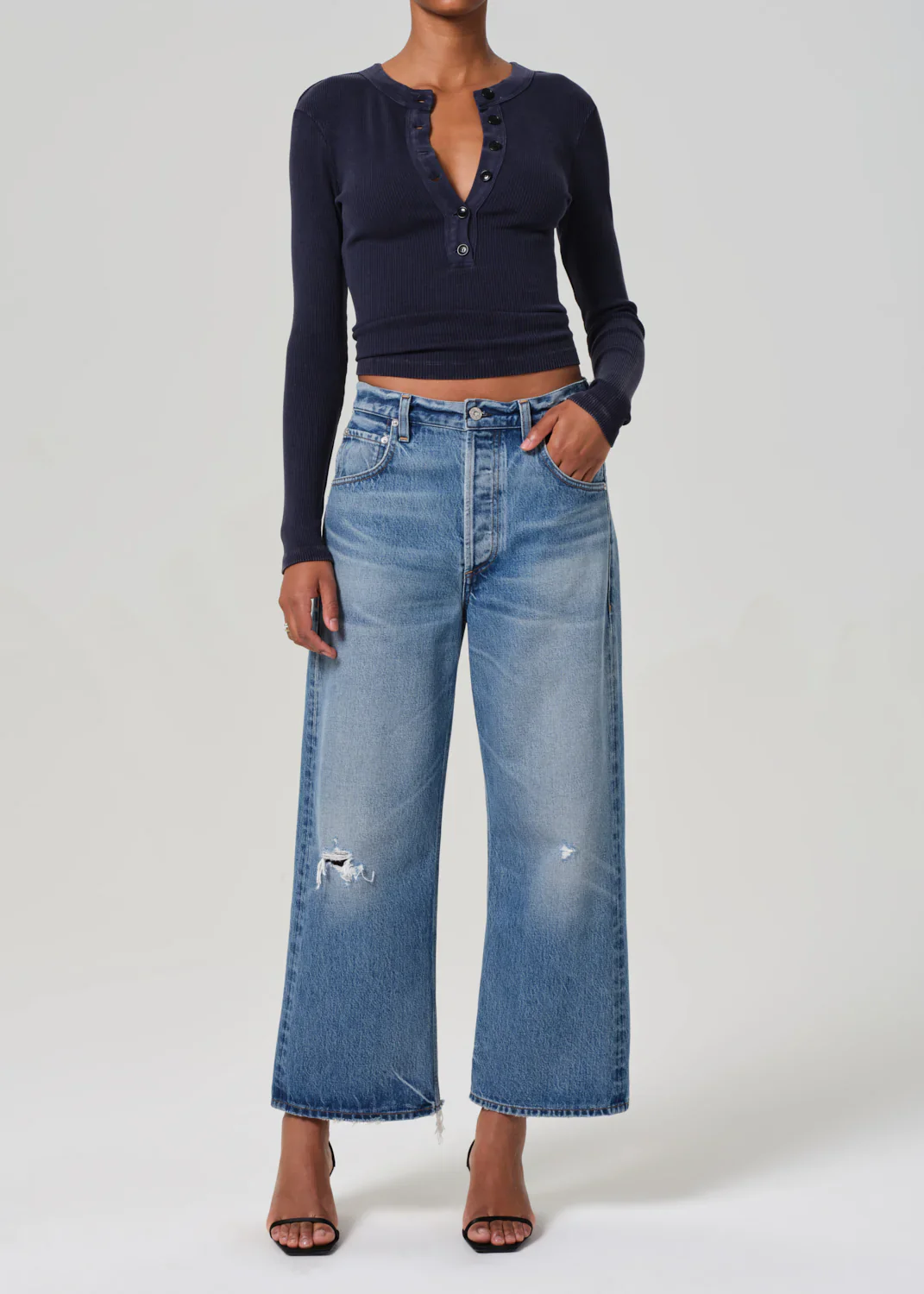 Looks Like: Dark to medium indigo with slight distressing at the knee