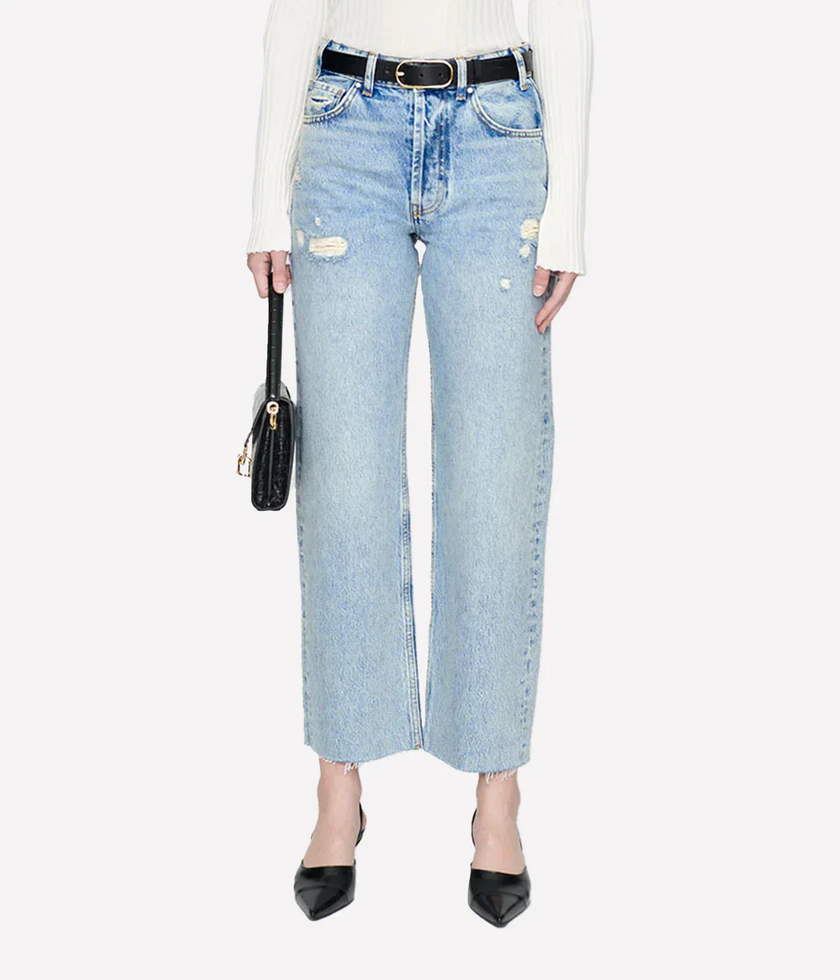A modern take on the boyfriend jean, crafted from 100% cotton rigid denim in a faded light blue wash. Featuring grinding at the back pockets, marbling, and vintage-inspired highs and lows, this jean is finished with a raw-edge hem for a laid-back yet stylish look.