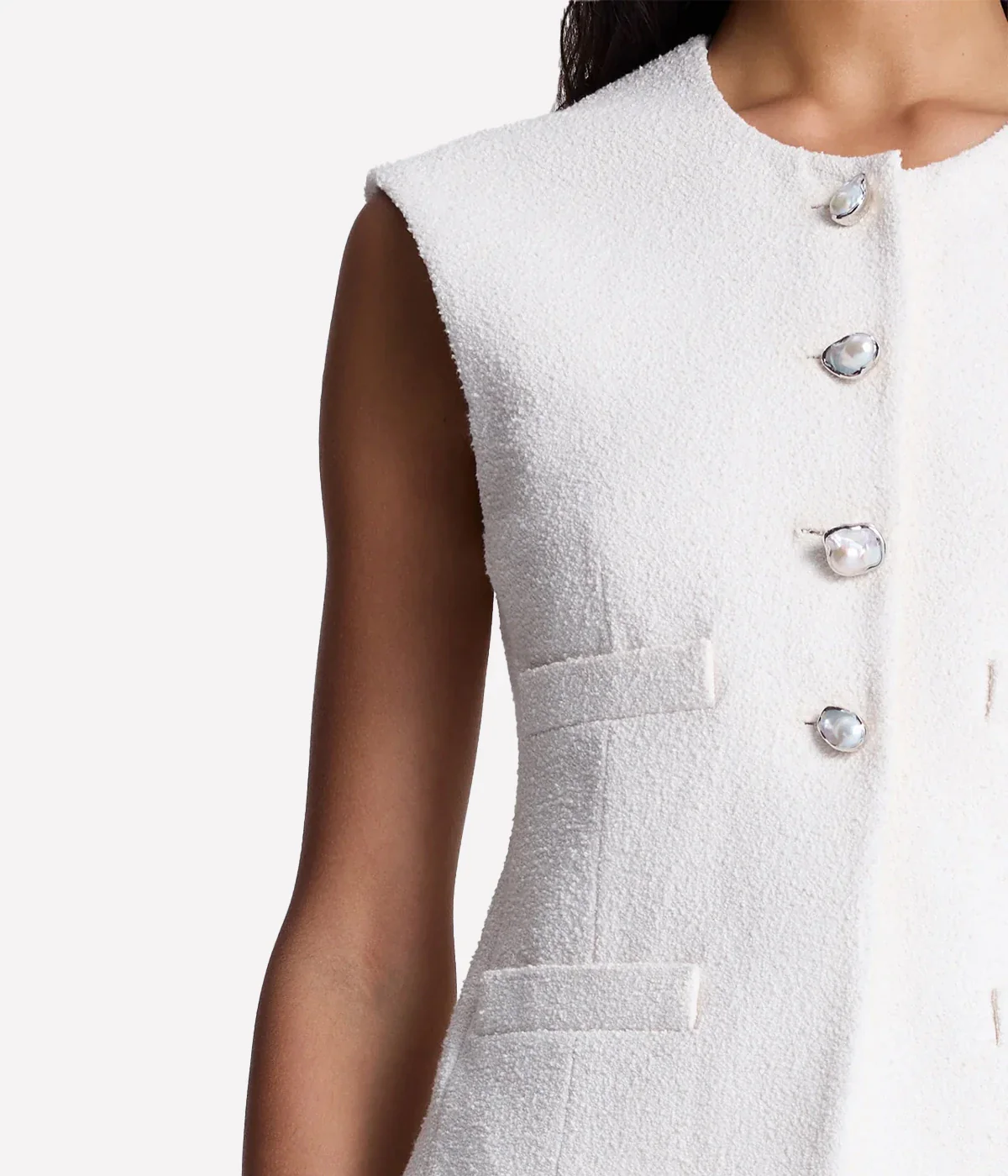 The Georgie Vest brings soft structure and elevated elegance to warm-weather dressing. Tailored in pearl-white Italian tweed, this refined silhouette is accented with sculptural freshwater pearl button closures for a touch of understated glamour. Featuring a clean round neckline, structured shoulders, and functional welt pockets, it balances femininity with modern polish.