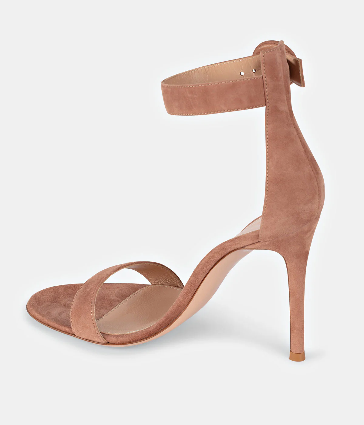 Gianvito Rossi’s signature Portofino stiletto sandals in luxurious suede praline bring sophistication to any ensemble.