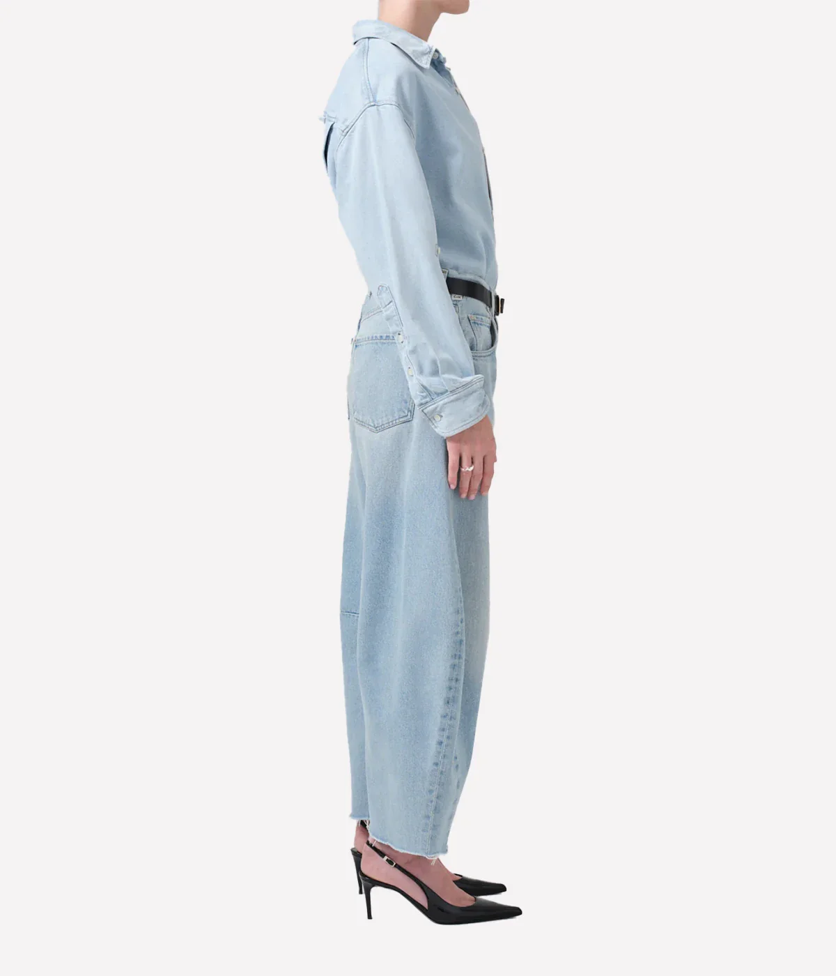 The Horseshoe Jean from the HUMANITY Collection is defined by its signature curved wide leg, tapered cropped hem, and raw edge finish—offering a bold silhouette with a nod to vintage charm. Crafted from non-stretch cotton denim in a soft indigo wash, it delivers structure and a lived-in feel for effortless, everyday wear.