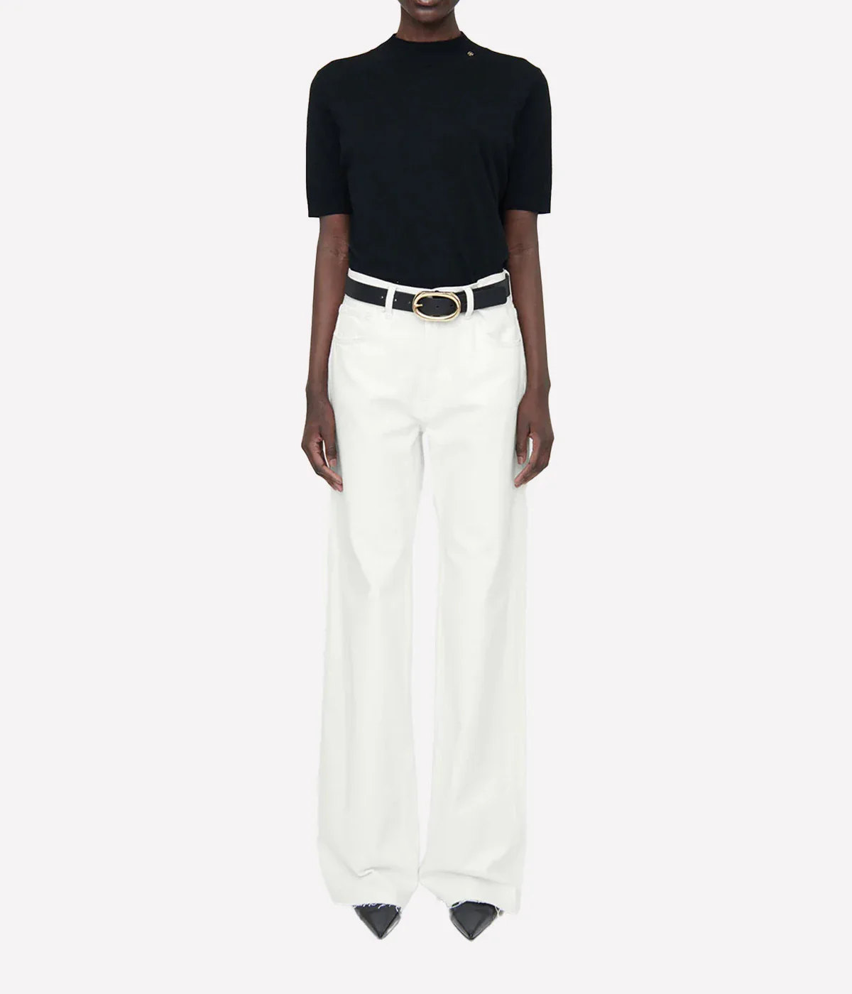 - Wide, long legs with a raw-edge hem for a relaxed, effortless vibe