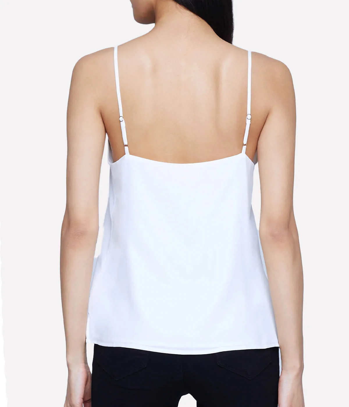 A classic white camisole with a soft matte finish. The relaxed shape drapes from a soft v-neckline, secured by adjustable spaghetti straps. Constructed using two layers of silk for complete coverage.
