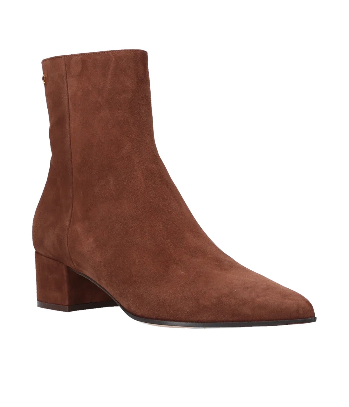 Expertly crafted with a sleek suede material and leather block heel, the Lyell 45 Suede Boot in Brown offers both style and comfort. The pointed toe and beige sole add a touch of sophistication, while the leather lining and easy zip closure provide practicality. Perfect for any occasion.