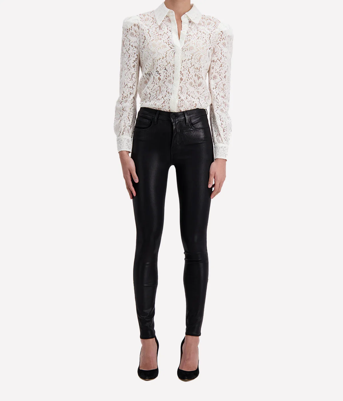 High-rise, cropped skinny silhouette with stretch coated denim