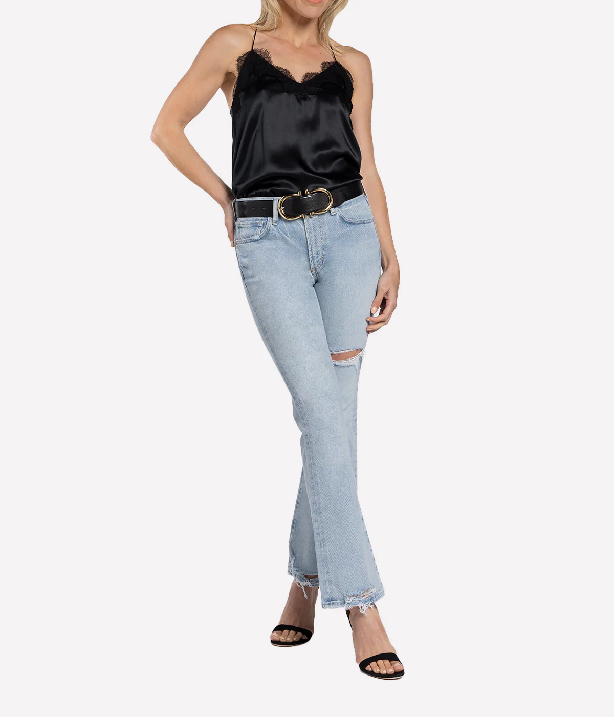 The Racer Charmeuse is crafted in a lightweight silk charmeuse and features a v neckline with delicate lace trimming. This camisole has a racer back and is a relaxed fitting silhouette. Made Internationally.