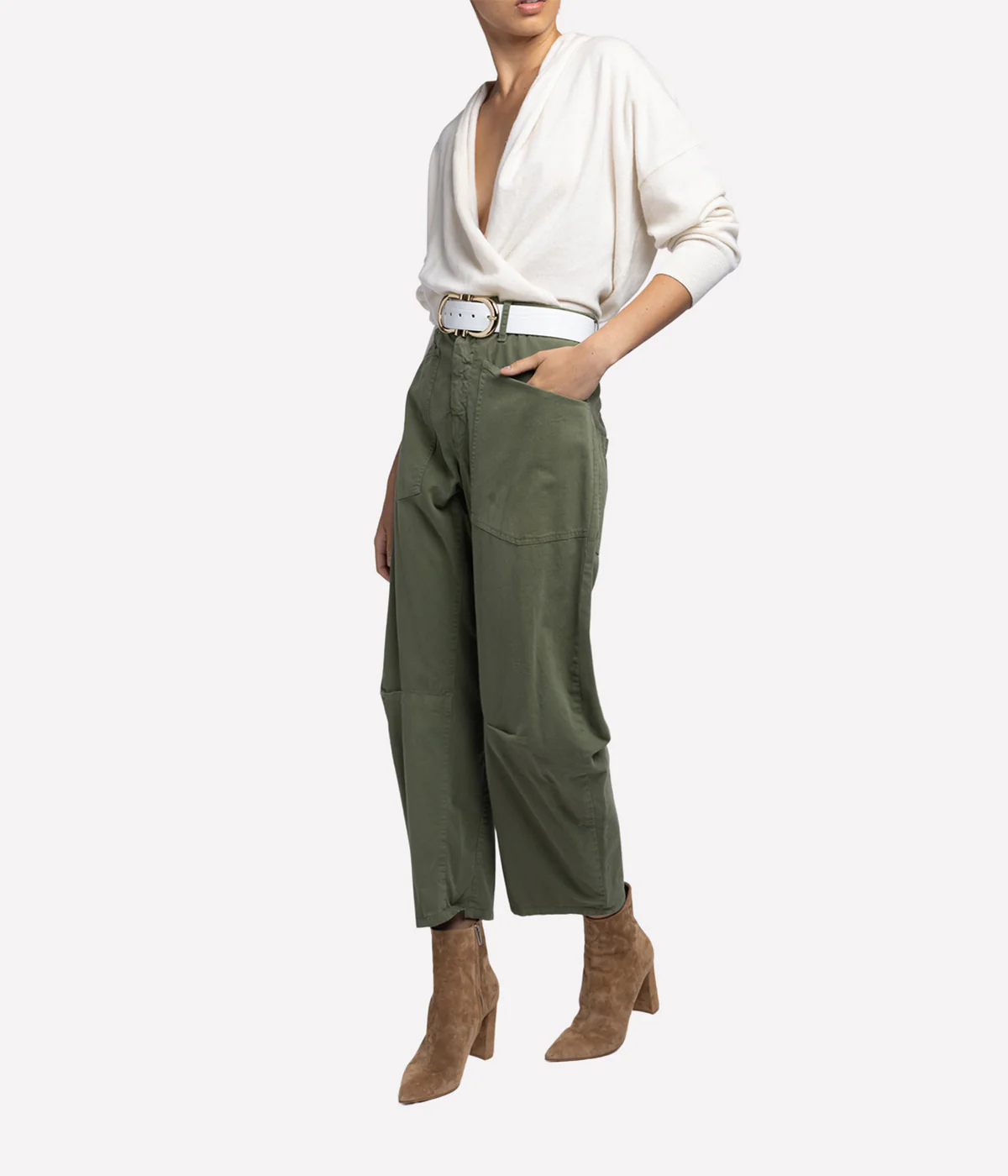 The Shon Pant in Camo Green by Nili Lotan adds a utilitarian edge to any wardrobe, featuring a relaxed, oversized silhouette with thoughtfully engineered curved seams. Crafted from soft cotton with a touch of stretch, it combines comfort with architectural style, making it a versatile staple for casual-chic dressing.