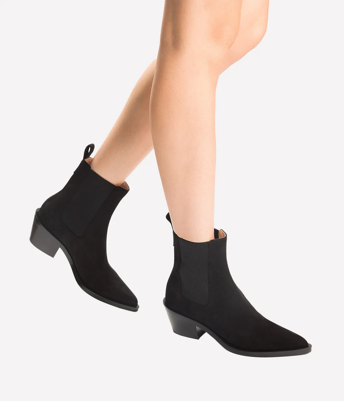 Experience the perfect blend of comfort and style with our Wylie Camoscio Stivale boots in black. Made from soft, luxurious suede in Italy, these pointed Western boots feature on-trend two-tone side elastics and a 55mm heel. These boots elevate any outfit with their timeless and versatile design, crafted from premium calf leather.